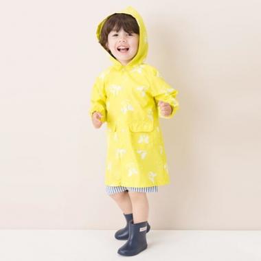 愛くるしい表情のブルドッグ柄が目を引くレインコートです。足あとやロゴをミックスした、オリジナリティーあふれるパターンが魅力♪ 雨が入りにくいフラップつきのポケットもポイント。おそろいの巾着がセットになっており、たたんでコンパクトに収納できます。・モデルサイズ95.5cm・着用サイズ90cm