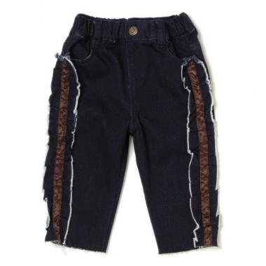 サイドのひらひらとしたフリルが可愛らしいデニムパンツです。ライン状のテープがレッグラインをきれいに整え、裾の切りっぱなしによって生まれるフリンジがこなれ感を演出♪ 落ち着いたネイビーと、さわやかなブルーの2色展開です。