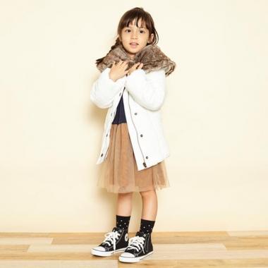 ボリューミーなネックでマフラー要らずなあたたかさの中綿ブルゾン。着脱式のフェイクファー衿がラグジュアリーなムードを演出します。大人っぽいシックなデザインはカジュアルからドレッシーまで幅広くマッチ。軽やかな着心地でデイリーコーデに大活躍です。・モデルサイズ104.5cm・着用サイズ110cm