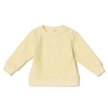 愛らしいお花模様のレース裏毛トレーナーです。デザインをシンプルにまとめたこちらは、生地の魅力が際立って◎。フチの部分はリブで切り替え、カジュアル感ただよう仕上がりに♪ 内側にお名前を記入できるタグつきです。※80、90サイズのみ肩開き